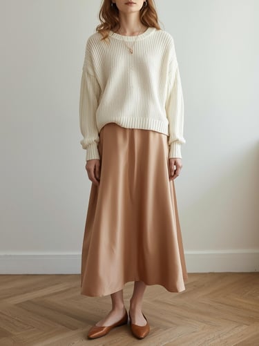 This combo is perfect for those slightly cooler spring mornings. A satin or silk slip skirt adds elegance and movement, while a lightweight sweater keeps things cozy without feeling heavy.