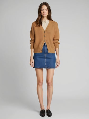 Button the cardigan halfway and slightly tuck it into the skirt to create shape. You can wear loafers for a polished feel or dainty sneakers for something more casual. Add a shoulder bag and subtle makeup for a soft daytime look. It’s cute, comfortable, and easy to rewear.