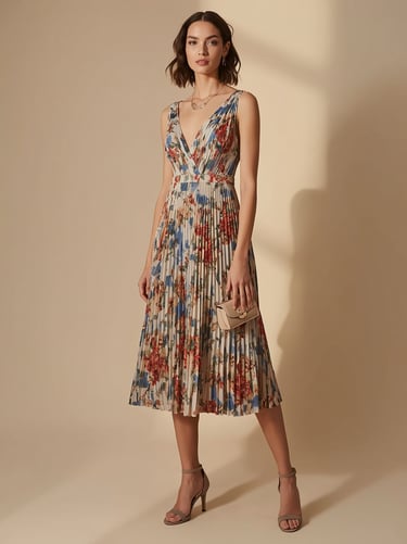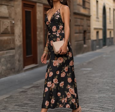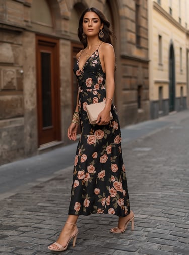 To accessorize, keep things light and delicate. Nude or strappy heels work perfectly, along with simple gold jewelry and a small clutch. You can also pull a subtle color from the floral print to match your bag or shoes, which makes the whole outfit feel more put together.