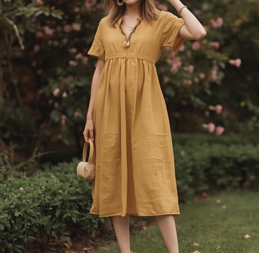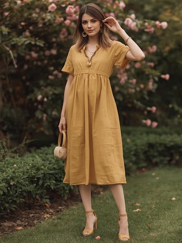 To accessorize, pair with neutral or woven accessories, simple gold jewelry, and comfortable heels or wedges. Keep everything soft and natural to match the vibe of the dress.